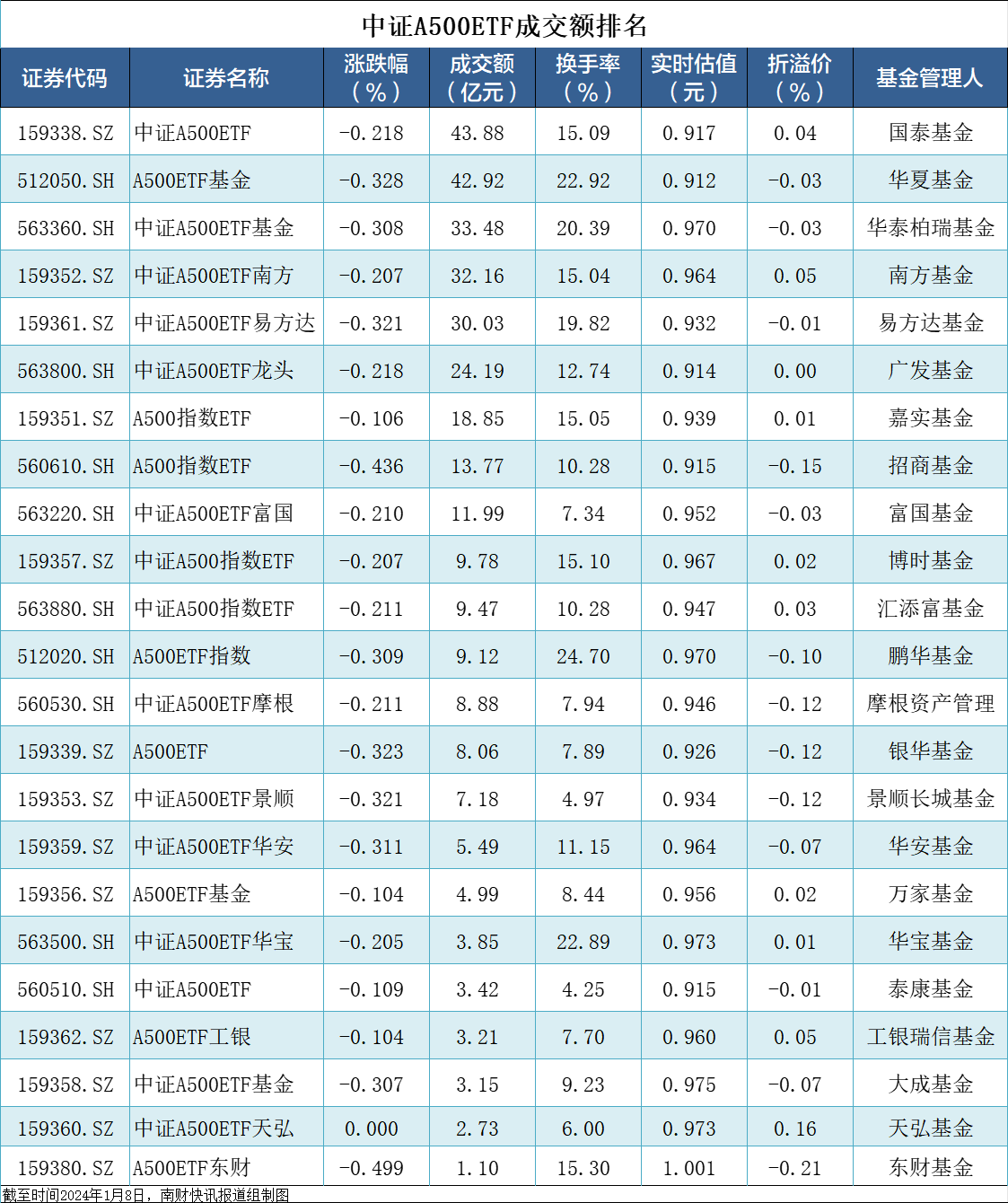 成交额方面,国泰中证A500ETF43.88亿元,名挨次一;换手率方面,有4只ETF居品进步20%,商场活跃度擢升;及时估值方面,仅新上市的东财A500ETF高于1元。